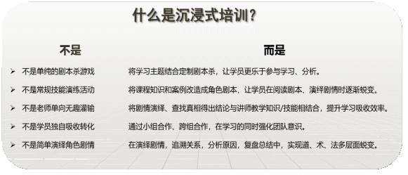 本課程將沉浸式劇本培訓(xùn)與面授輔導(dǎo)相結(jié)合。運(yùn)用新穎的學(xué)習(xí)方式,激發(fā)學(xué)員的學(xué)習(xí)興趣及動(dòng)力,提升培訓(xùn)效果及滿意度。